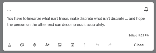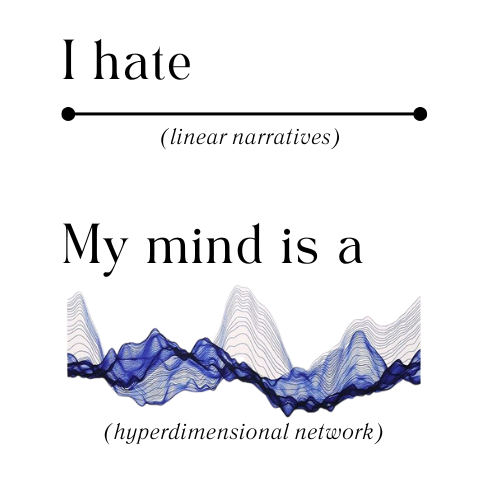 I don’t experience life as a straight line. My mind is a hyperdimensional network. Everything connects to everything else. Every moment shows up already carrying what caused it and what it’s going to break later. By the time something happens, I’m already thinking about what it implies. The world wants linear narratives. I can’t do it.